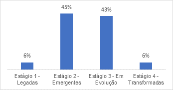 Em segundo lugar, representando 43% da base, estão as organizações ‘Em Evolução’ e que estão mais avançadas do que as anteriores (Emergentes), mas têm um nível de modernização tecnológica moderado.