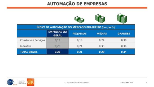 Entre os setores, a indústria, com um índice de automação de 0,26, mostra-se mais automatizada do que o comércio/serviços, onde o índice é 0,19. O índice das pequenas indústrias é de 0,24, das médias é de 0,33 e das grandes é de 0,38. Comércio e serviços têm índices entre 0,18 e 0,30, de acordo com suas necessidades e porte de negócios. O estudo aponta que o país tem 0,22 de índice de automação para as empresas do Brasil.