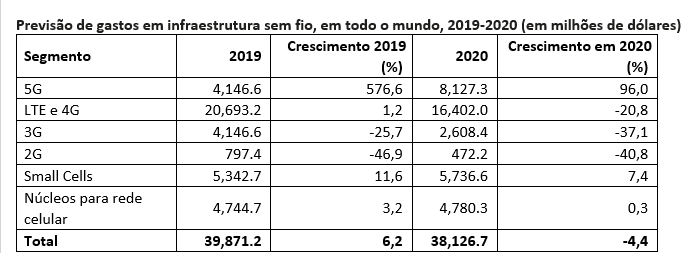 No total, porém, os gastos com infraestrutura sem fio deverão diminuir 4,4%, registrando US$ 38,1 bilhões, em 2020. Os investimentos realizados pelas operadoras e fornecedores de serviços CSP (Communications Service Providers, na sigla em inglês) em infraestrutura de rede 5G representaram 10,4% da receita total da infraestrutura sem fio em 2019. Esse número chegará a 21,3% em 2020.