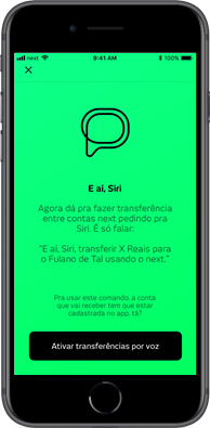 O Next acaba de anunciar mais uma novidade para facilitar ainda mais a vida dos clientes. Os usuários de iPhone passam a contar com a solução de transação por voz, por meio da SIRI, para o serviço de transferência entre contas. Para ativar, o cliente habilita o comando no app do Next.