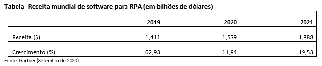 Levantamento do Gartner revela que a receita mundial com software de automação robótica de processos será de cerca de US$ 2 bilhões em 2021