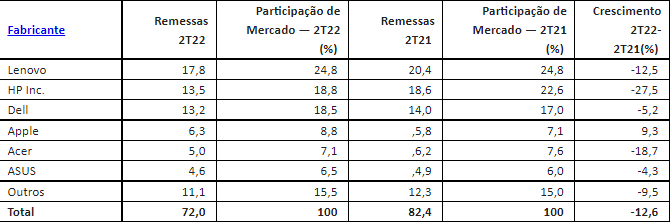 Os três principais fornecedores do mercado mundial de PCs sofreram declínios nas remessas de PCs no segundo trimestre de 2022, mas sua classificação permaneceu inalterada. A combinação de queda de 27,5% da HP e de 5,2% da Dell permitiu que a própria Dell chegasse a 0,3 ponto percentual em relação a HP em participação de mercado. A Apple foi o único fornecedor a registrar crescimento no segundo trimestre de 2022, impulsionado pela popularidade do dispositivo M1.