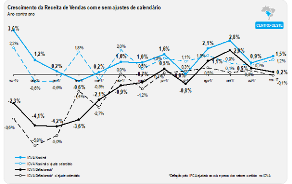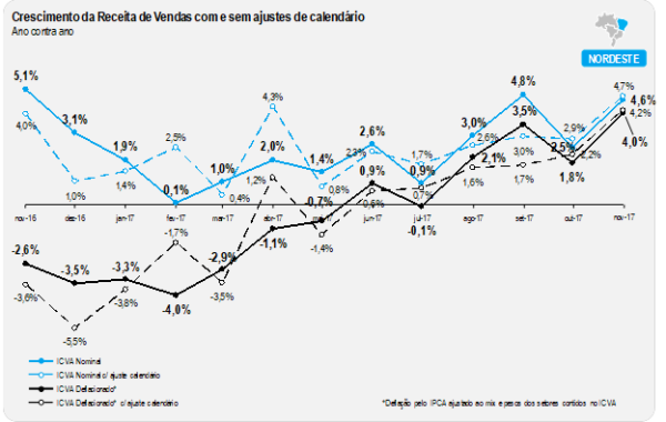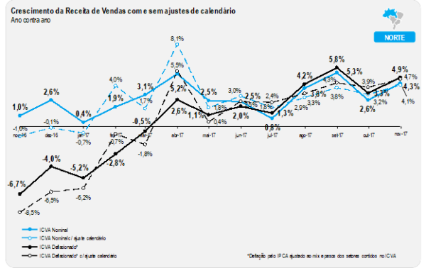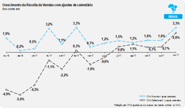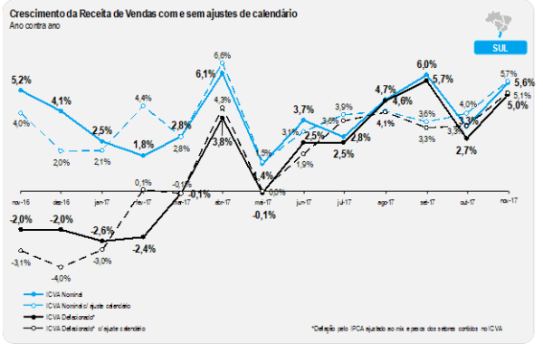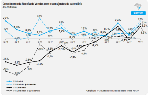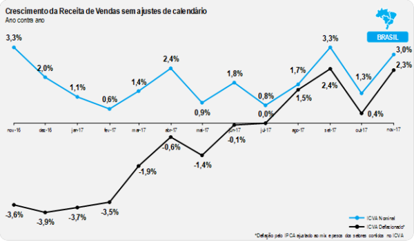 Vale ressaltar que o desempenho do mês de novembro de 2017 ainda foi levemente prejudicado pelo calendário, por conta da distribuição dos feriados em dias de semana diferentes de 2016. Ajustados estes efeitos, o índice apontaria uma alta de 2,6%, uma aceleração em relação a outubro na mesma base de comparação (0,7%).
